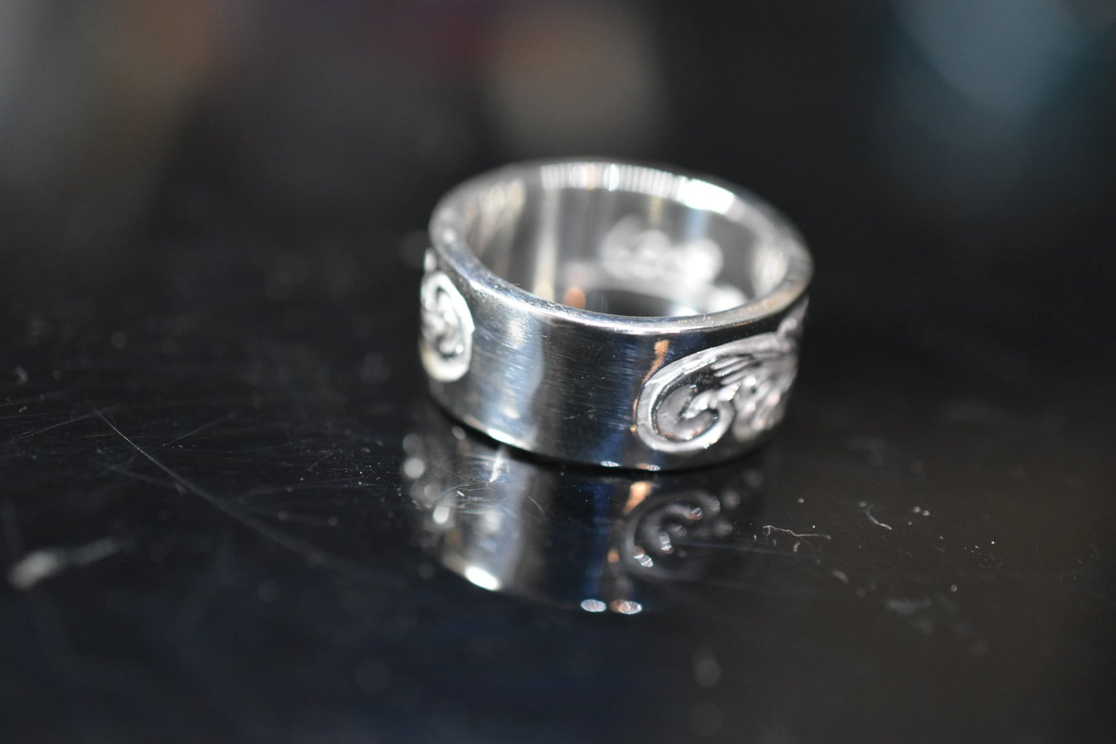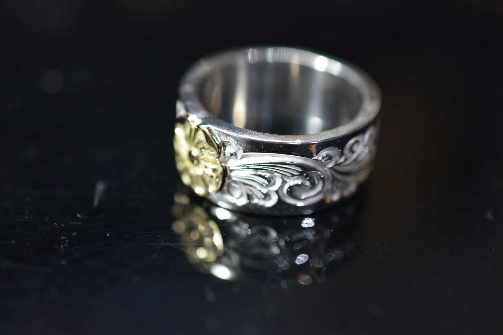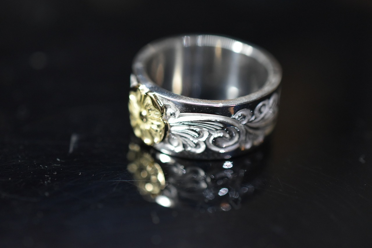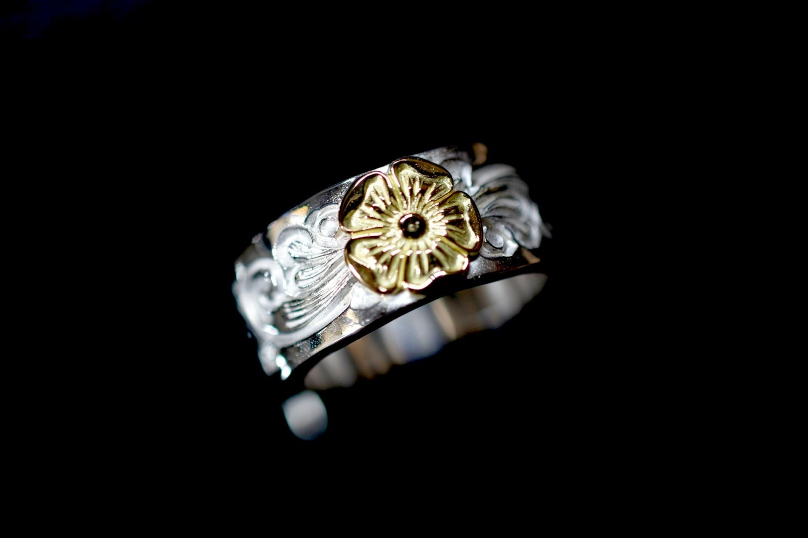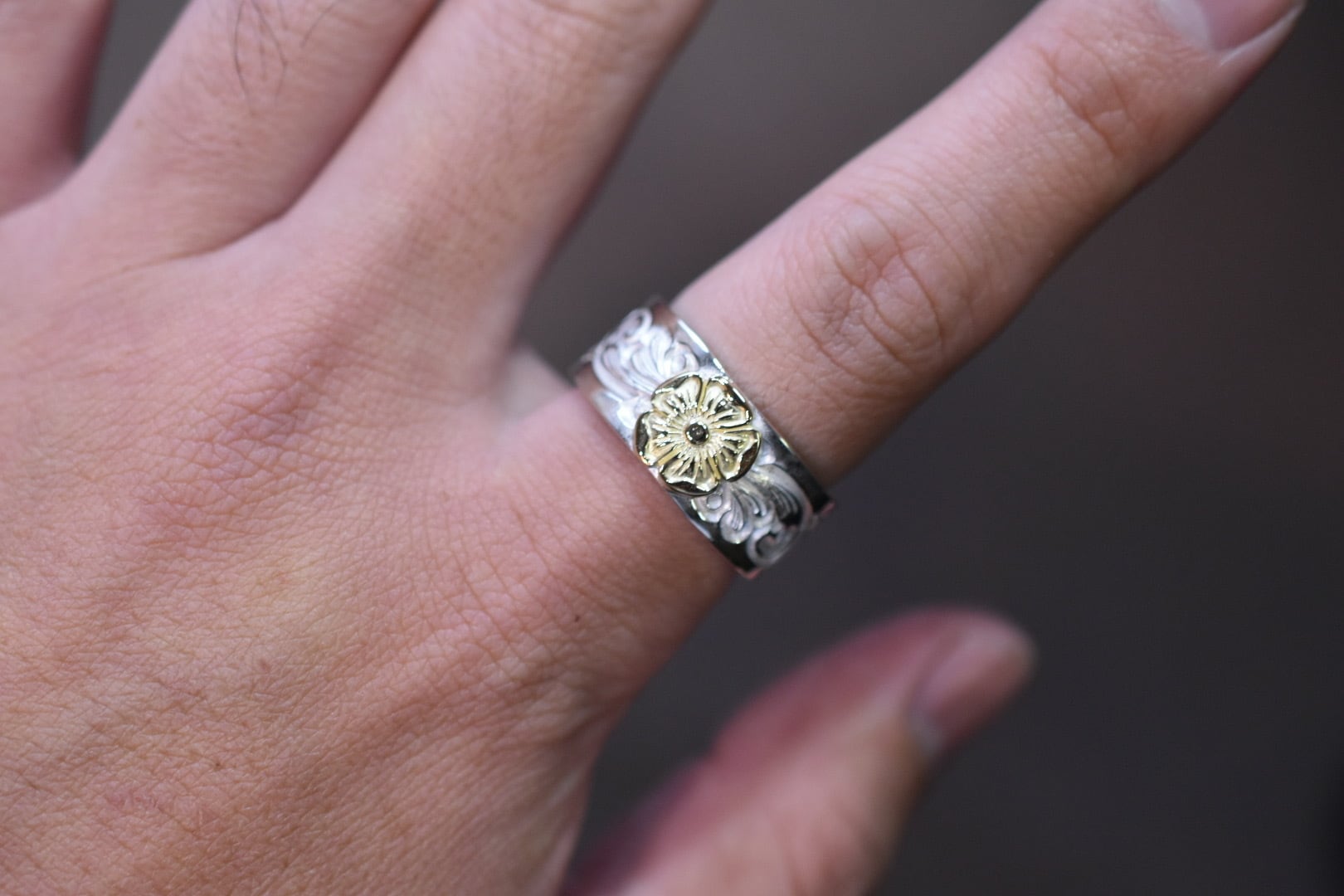 シルバーリングにオリジナルのタガネで唐草一本一本打ち込んで、shun.のLoveのシンボルのローズを中心に唐草を打ち込んで仕上げています。