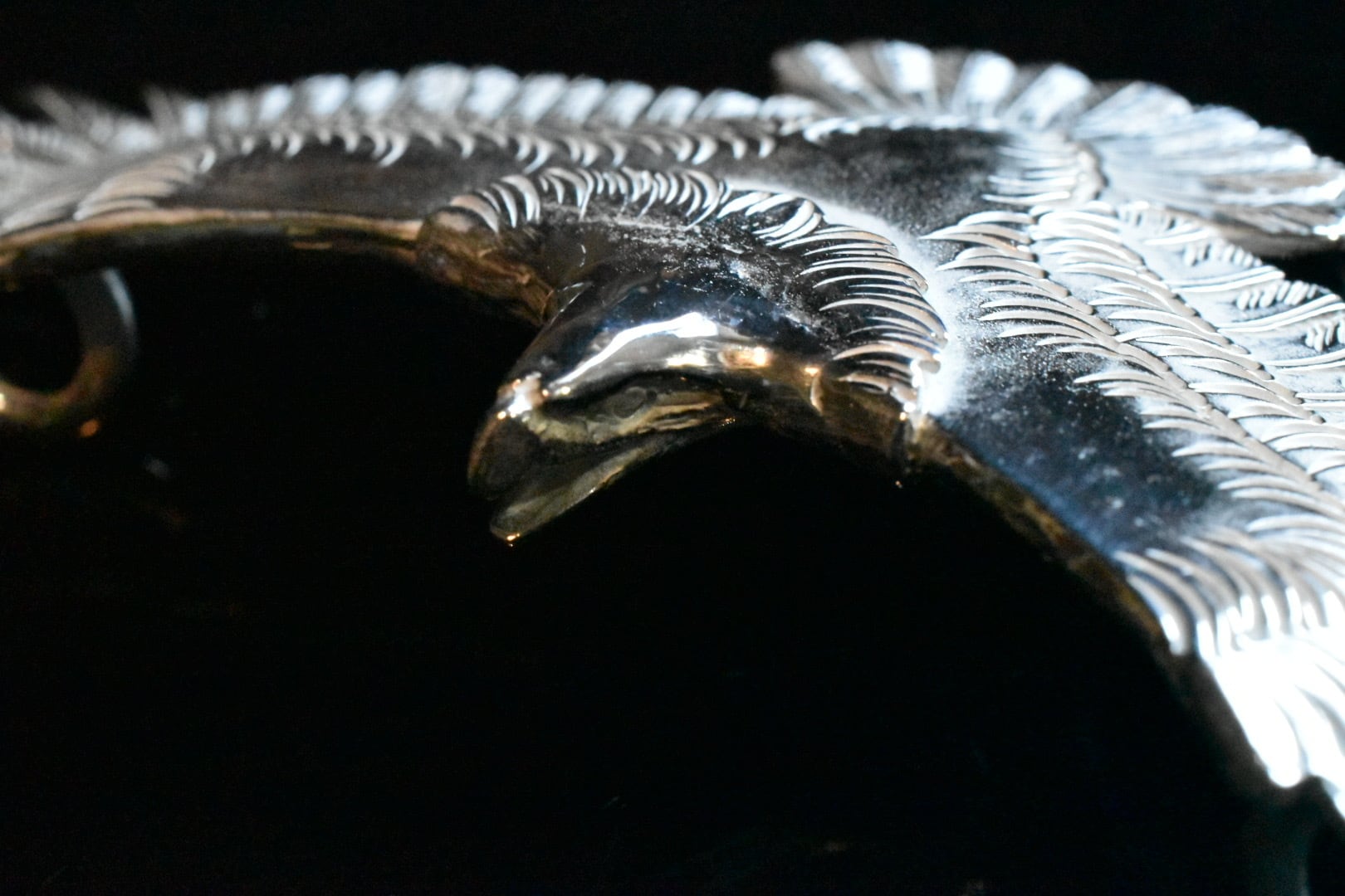 リアルなイーグルが大空を太陽に向かっている様子を、職人の手で、銀の板、塊を削ってハンドメイドで形にしています。