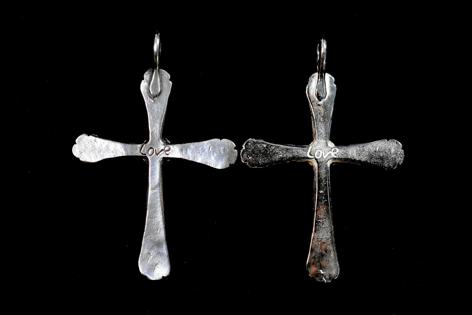 シルバークロスにオリジナルのタガネで唐草一本一本打ち込んで、Love rose を合計5つ付け薔薇の花束をクロスで再現しています。