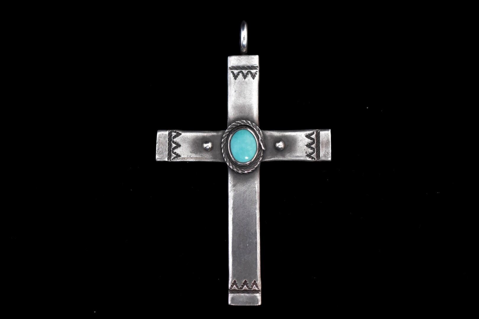 ヘビが巻き付いた石枠を配置し、そこにターコイズをセットして、ターコイズの鮮やかな色味とLifeの力が入った、シンプルながらトラディショナルなクロスに仕上がりました。