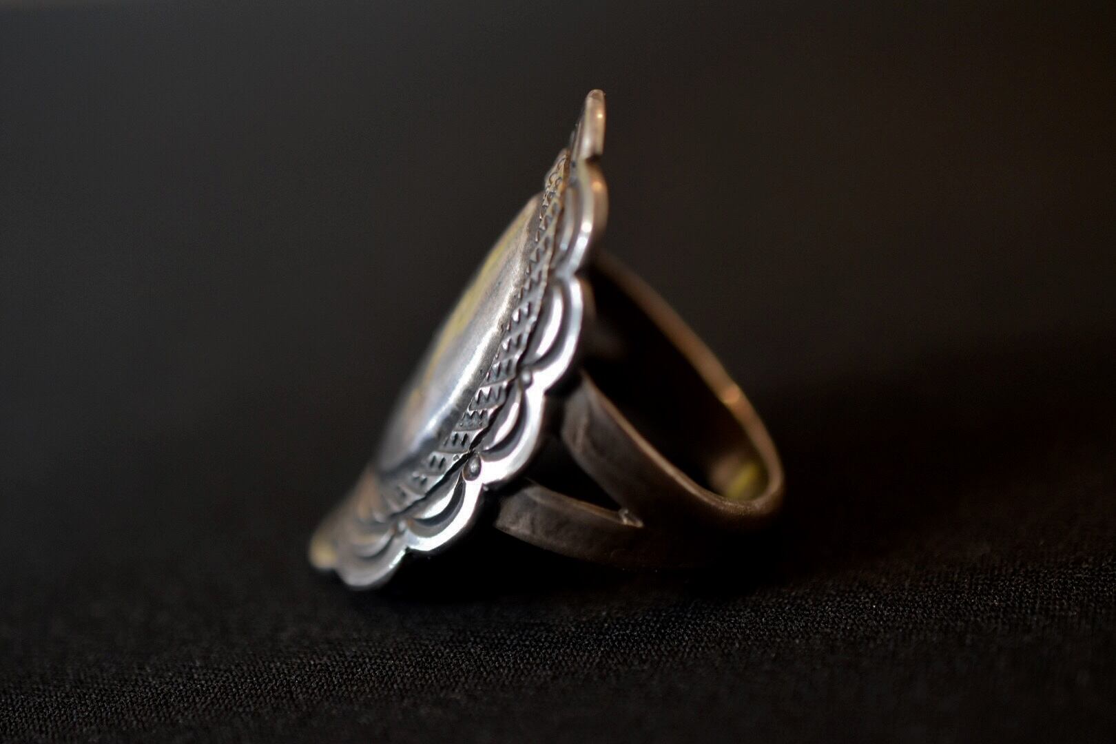 大ぶりなコンチョを大胆にリングにして、存在感のあるリングに仕上がっています。