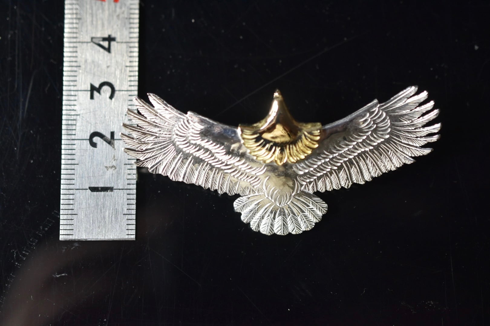 リアルなイーグルが大空を太陽に向かっている様子を、職人の手で、金と銀の板、塊を削ってハンドメイドで形にしています。