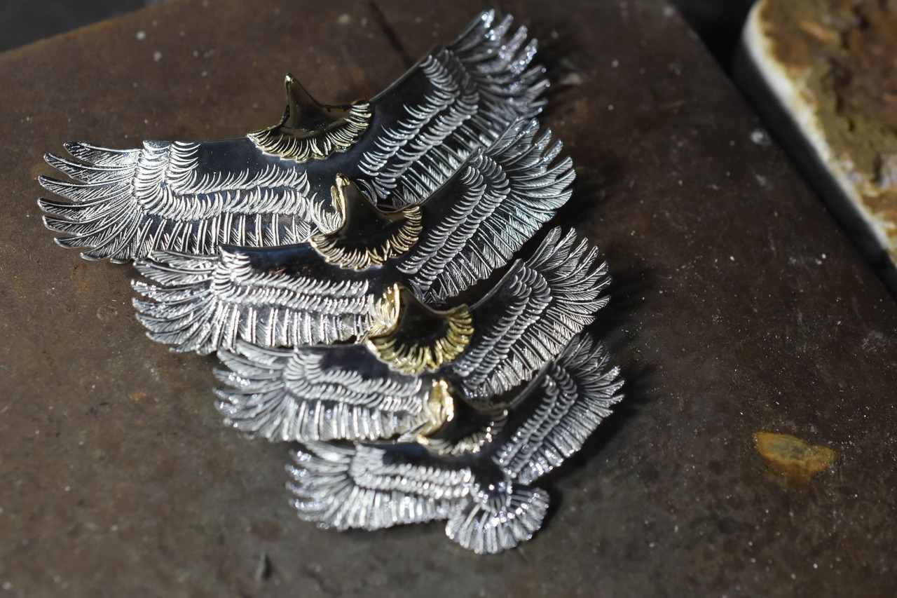 リアルなイーグルが大空を太陽に向かっている様子を、職人の手で、金と銀の板、塊を削ってハンドメイドで形にしています。