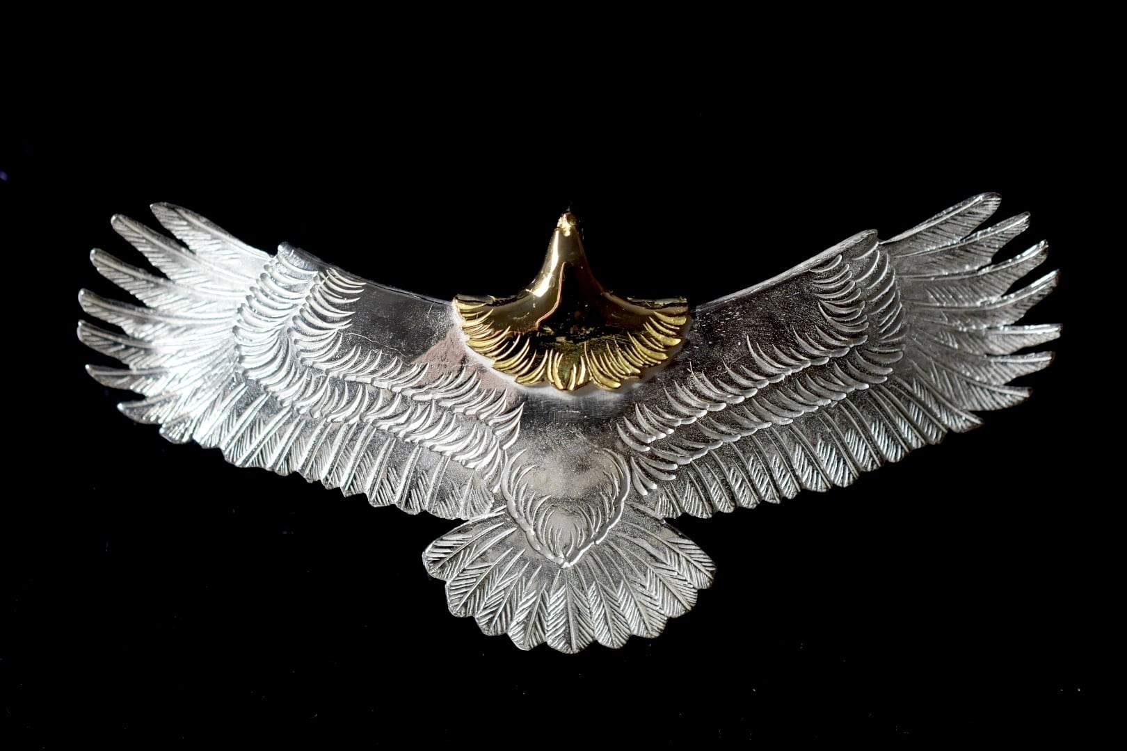 リアルなイーグルが大空を太陽に向かっている様子を、職人の手で、金と銀の板、塊を削ってハンドメイドで形にしています。